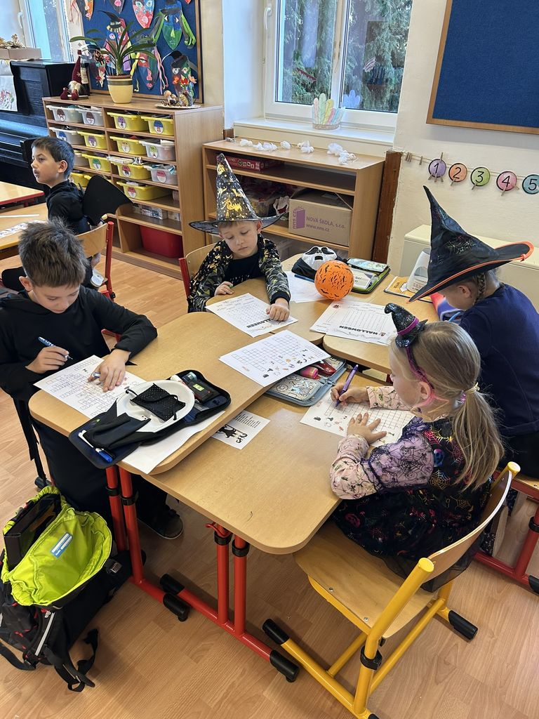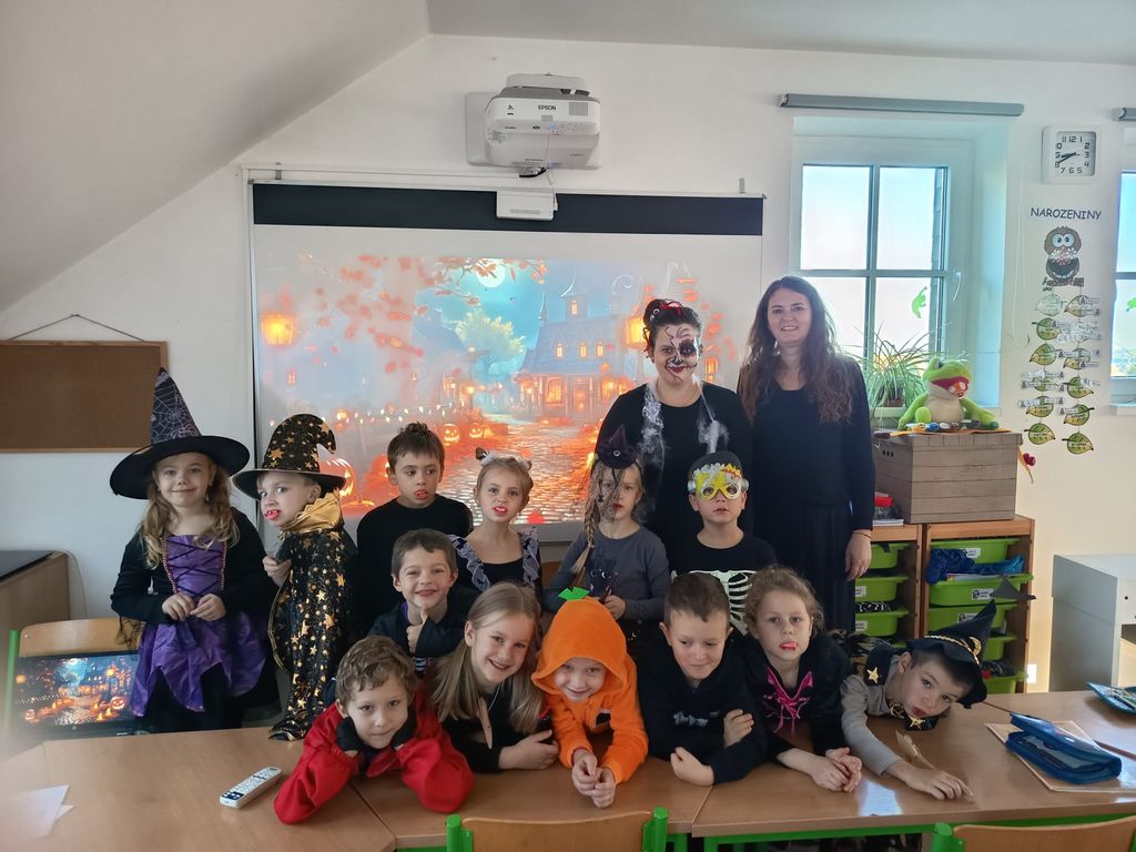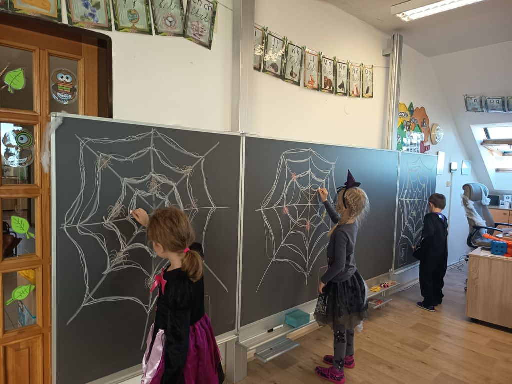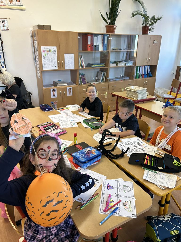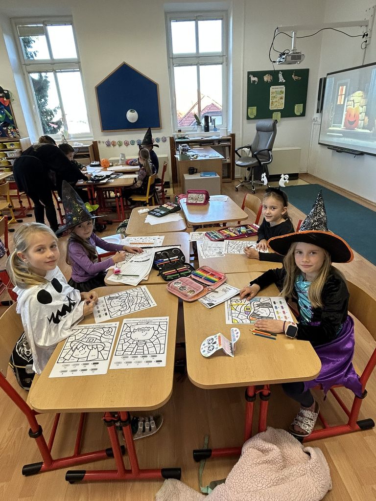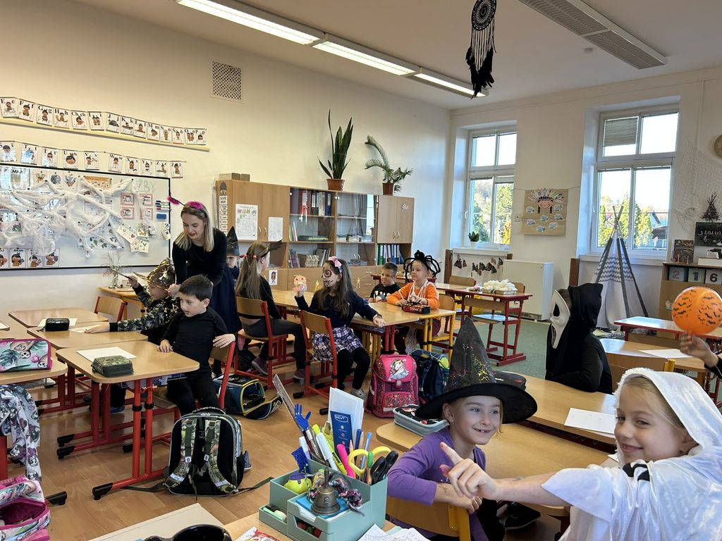 Každá třída měla svůj vlastní program – děti plnily tematické pracovní listy, povídaly si o tradicích, procvičovaly učivo v halloweenském duchu a nechyběl ani strašidelný taneček či „halloweenský tělocvik“, který si všichni naplno užili. Téma Halloweenu jsme však otevřeli také v hodinách angličtiny. Žáci se seznámili s novou slovní zásobou, tradicemi i způsobem, jak se Halloween slaví v anglicky mluvících zemích.