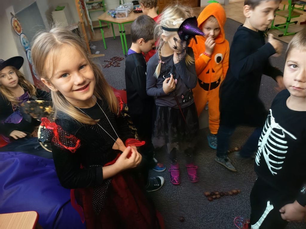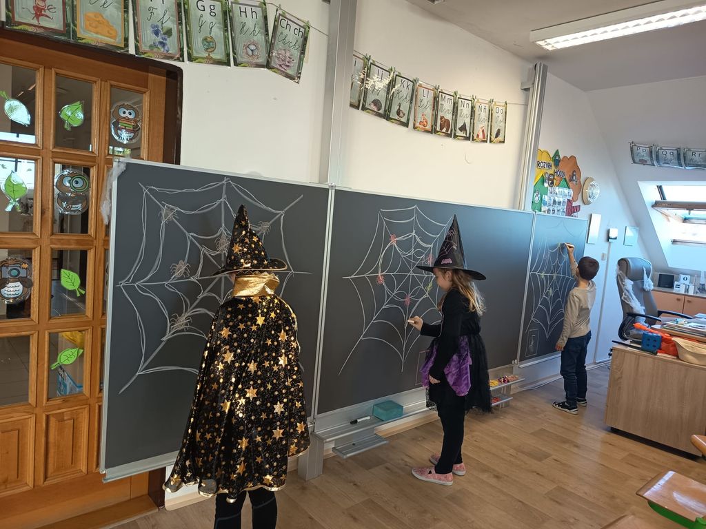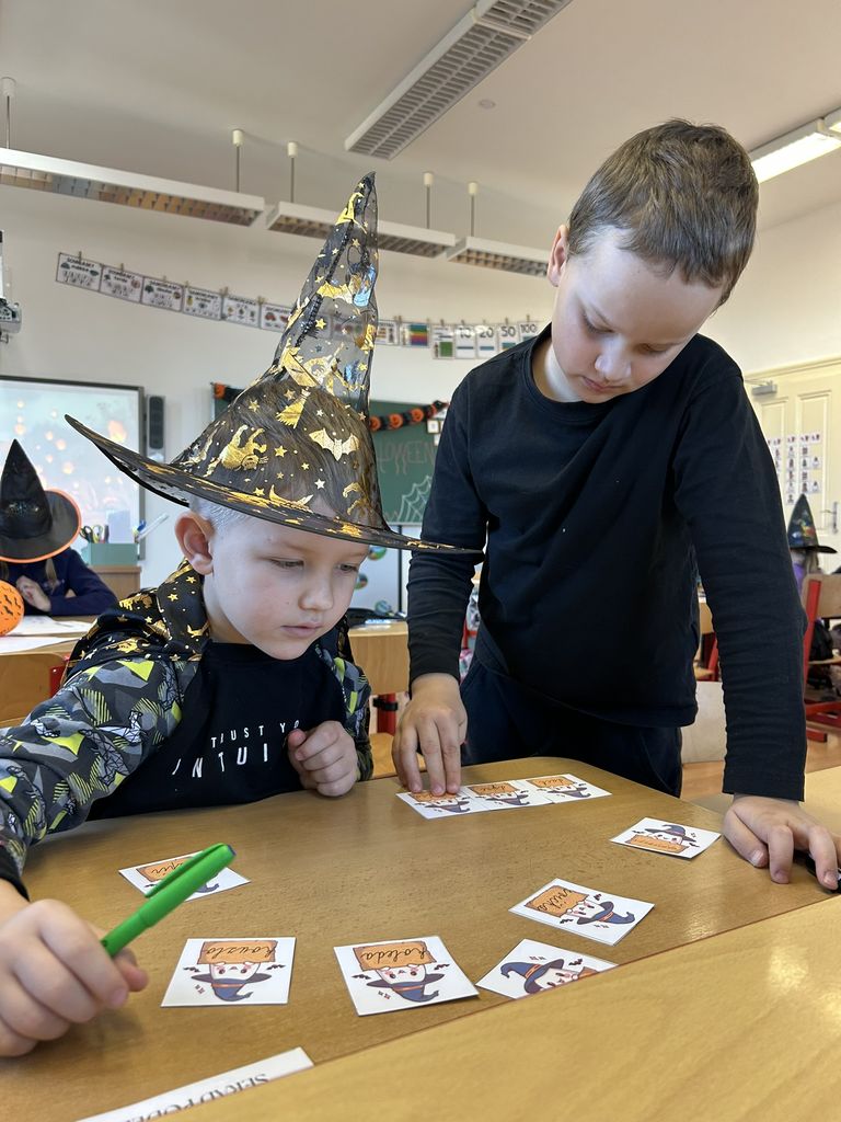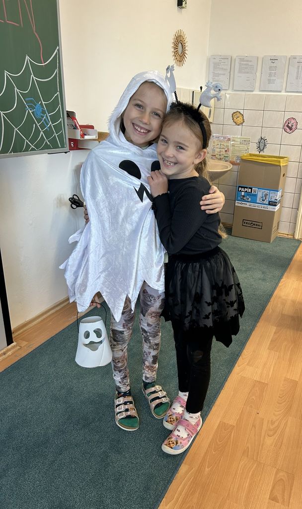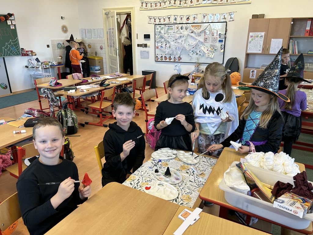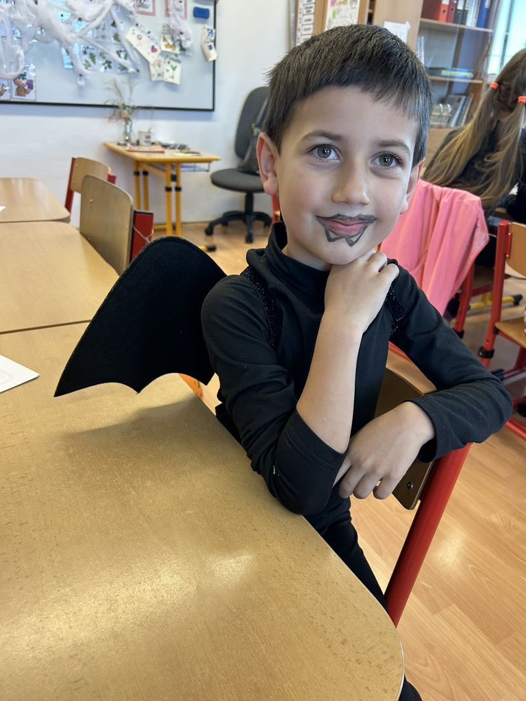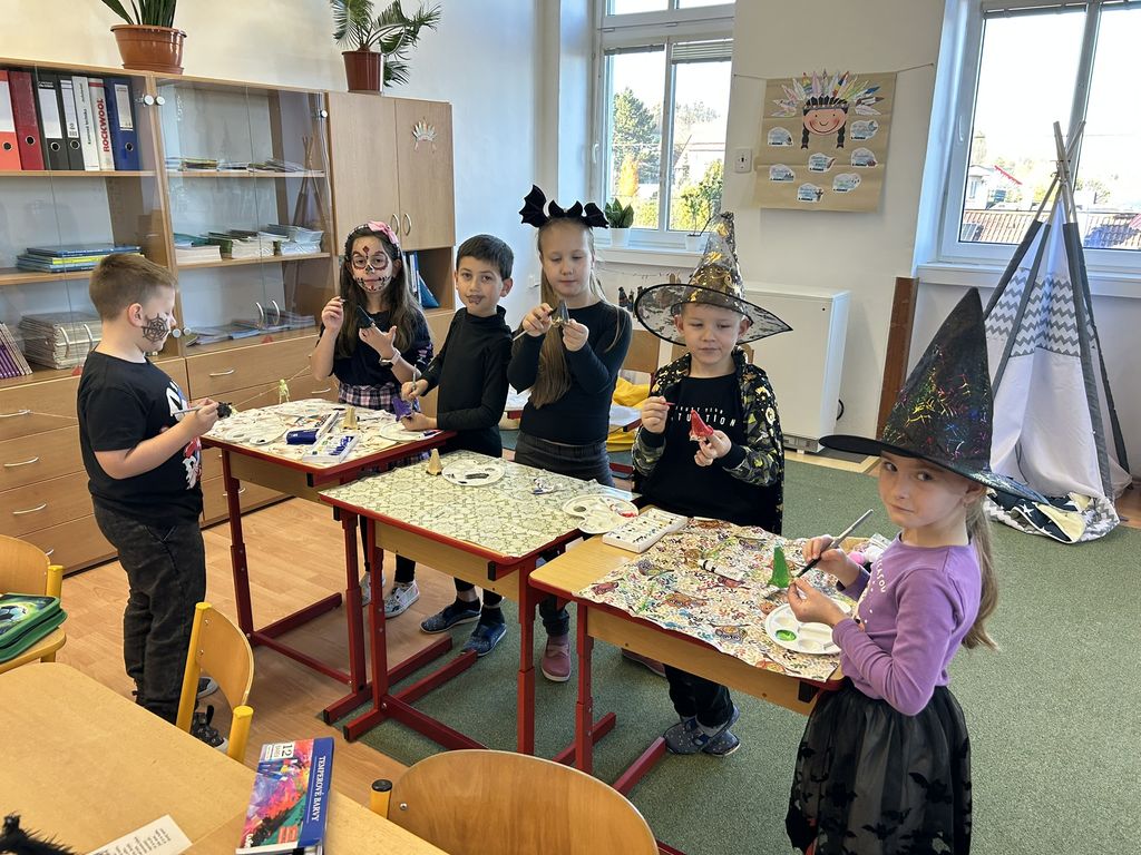 Každá třída měla svůj vlastní program – děti plnily tematické pracovní listy, povídaly si o tradicích, procvičovaly učivo v halloweenském duchu a nechyběl ani strašidelný taneček či „halloweenský tělocvik“, který si všichni naplno užili. Téma Halloweenu jsme však otevřeli také v hodinách angličtiny. Žáci se seznámili s novou slovní zásobou, tradicemi i způsobem, jak se Halloween slaví v anglicky mluvících zemích.