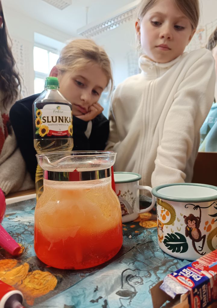 Na závěr si děti vyzkoušely zajímavý pokus – objevily, jak pomocí vody, oleje, barviva a šumivých tablet vytvořit vlastní lávovou lampu. Tento zajímavý experiment byl pro mnohé tou nejzajímavější částí dne.